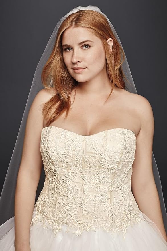 9wg3830. No alterations have been made to the dress. Bridal boutique davids bridal beaded lace and tulle ball gown wedding dress style v3836 89900. The lace applique sweetheart top and tiered organza skirt are centered by a slim pearl and crystal waistband that lends this plus size read more. I am 57 and the dress goes all the way to my feet.