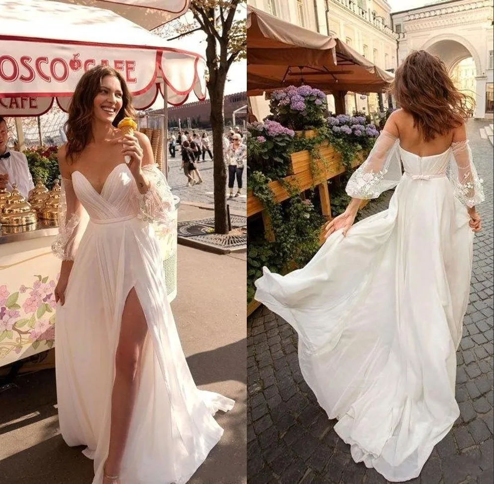 Buy Vintage Chiffon Beach Wedding Dress 2019 Summer White Cap