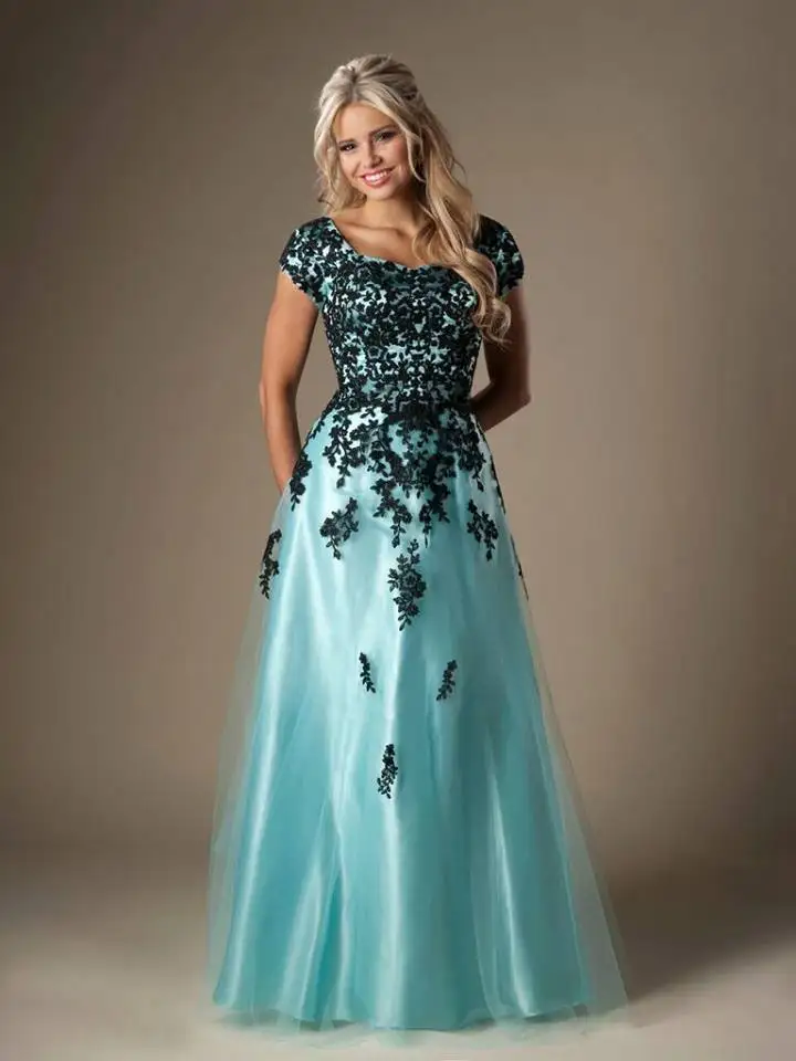 Mint Pink Black Long A Line Simple Modest Prom Dresses With