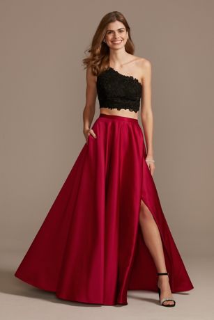 Asymmetric Lace Crop Top And Satin Split Skirt Set David S Bridal