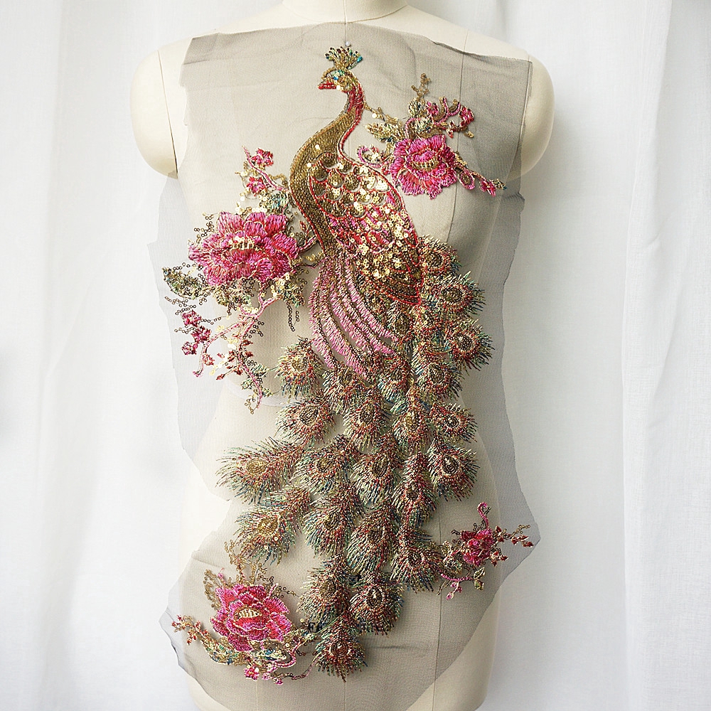 Black Tulle Embroidery Gold Sequin Peacock Bird Applique Lace