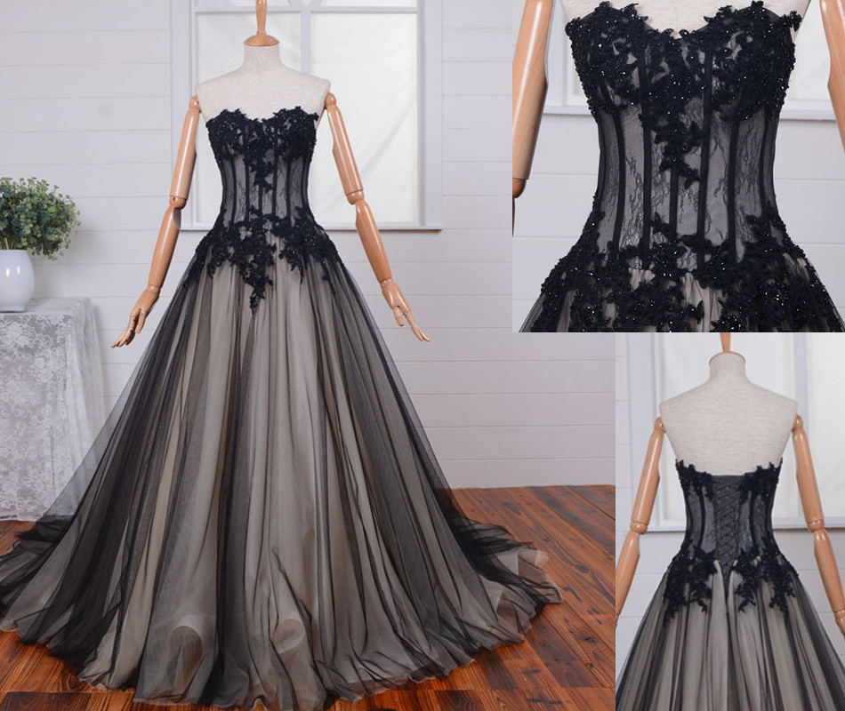Black Lace Appliques Sweetheart Floor Length Tulle Wedding Gown