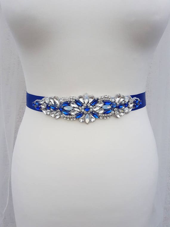 Blue Bridal Sash Wedding Dress Sash Belt Rhinestone Crystal