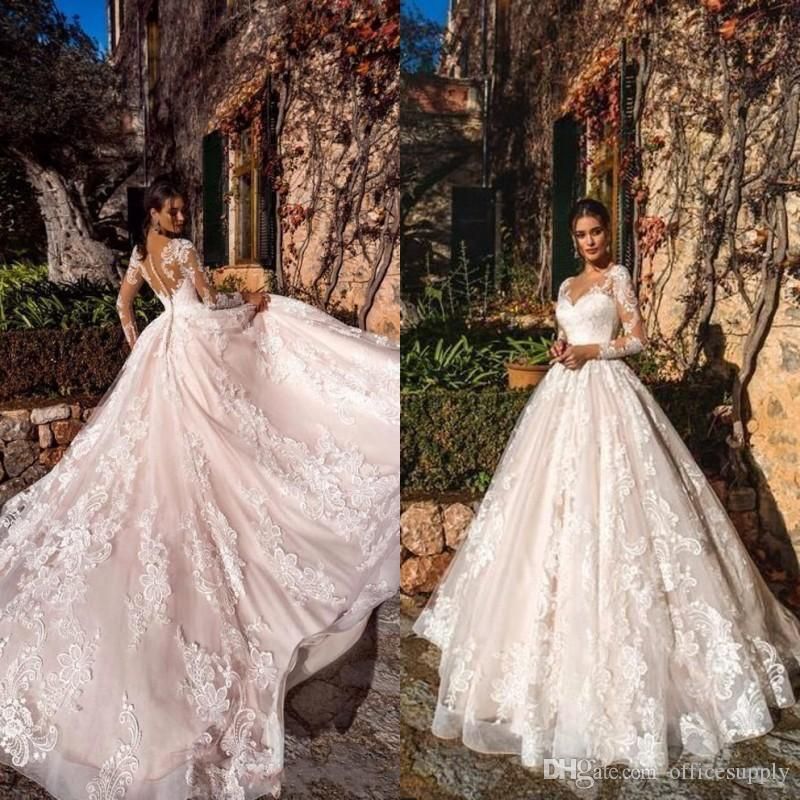 Discount 2020 Vintage Plus Size Blush Pink Wedding Dresses Sheer V Neck Long Sleeves Lace Court Train Wedding Dress