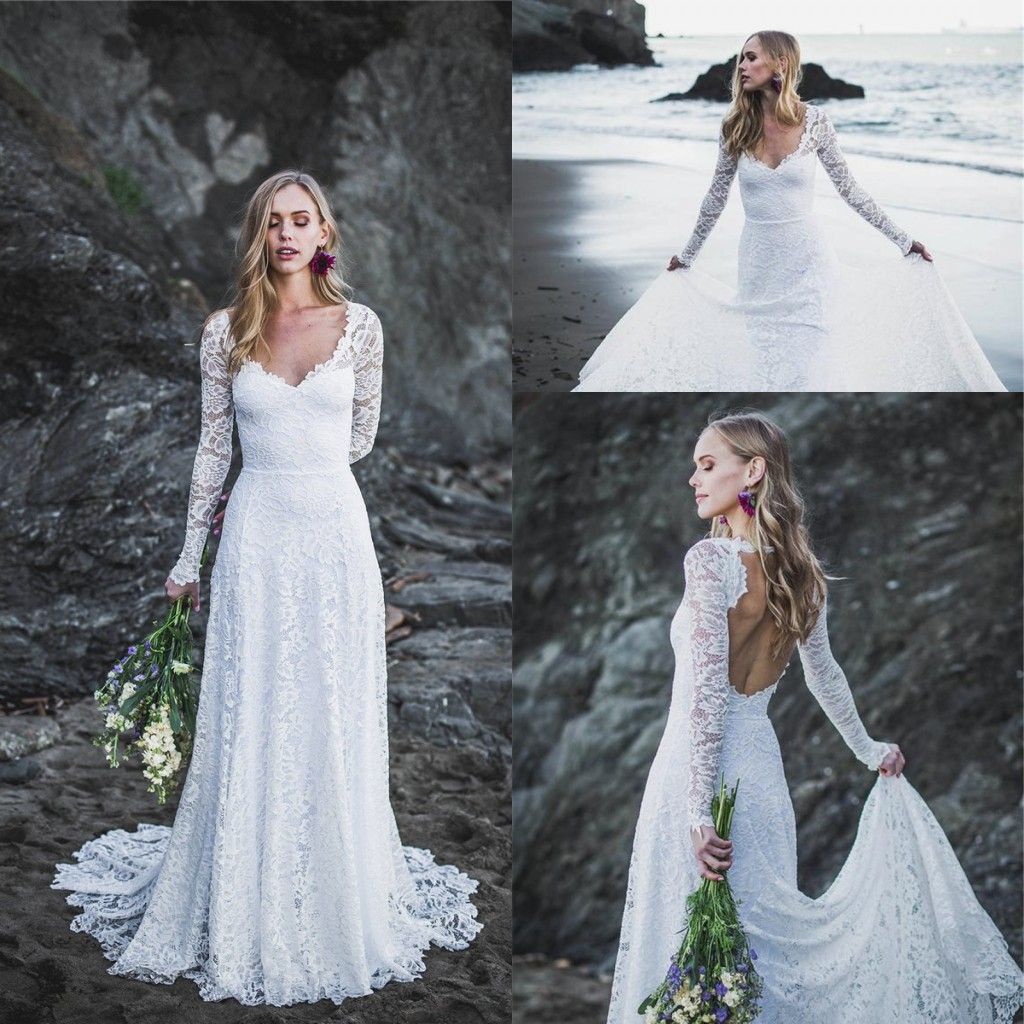 2020 Vintage Ivory Bohemian Lace Beach Wedding Dress Long Sleeve V