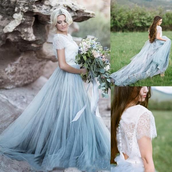 Boho A Line Round Neck Lace Sleeves Open Back Two Piece Wedding