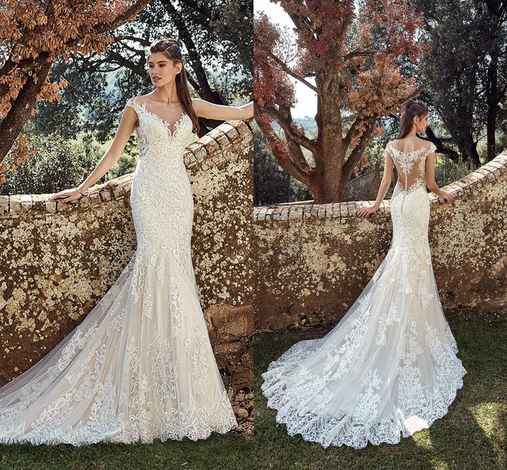 Sexy Beach Full Lace Mermaid Wedding Dresses Beach 2019 Sheer Neck
