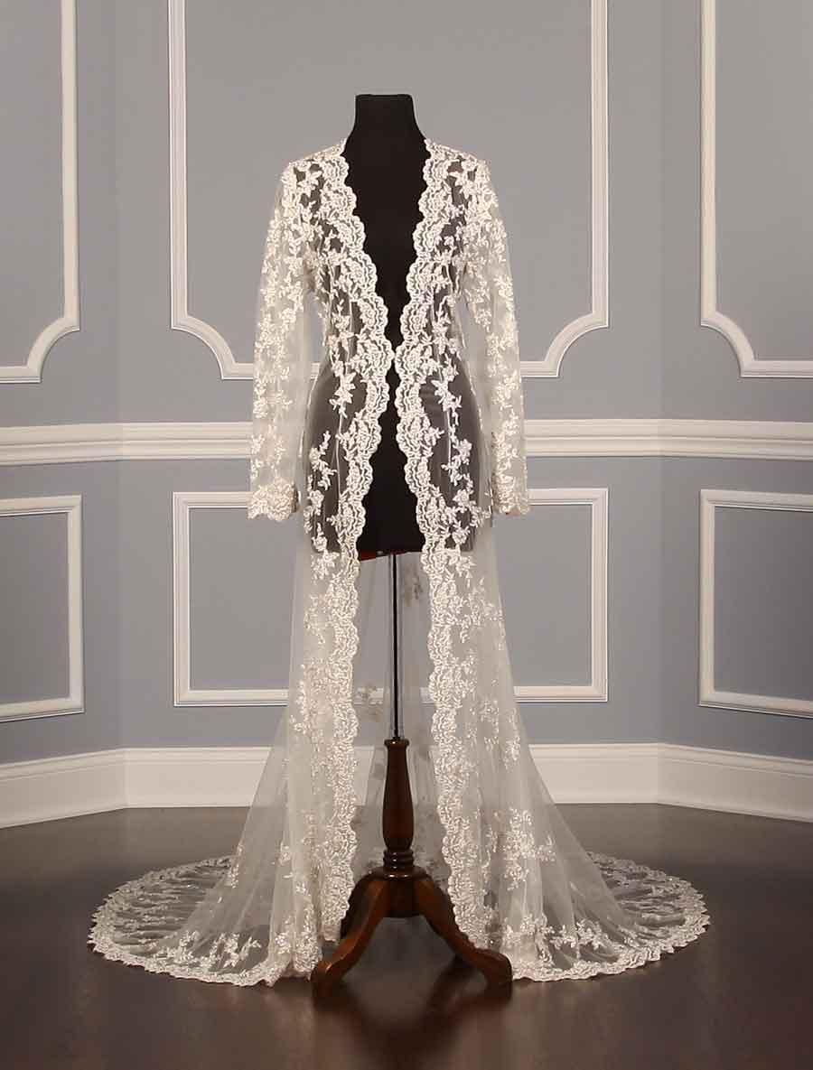 Swan Queen Long Bridal Lace Robe Gown With Scalloped Train In