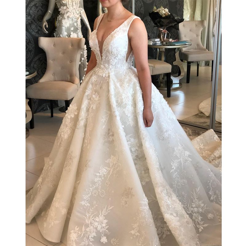 Gorgeous Deep V Neck 3d Flowers Ball Gown Wedding Dresses Pearls