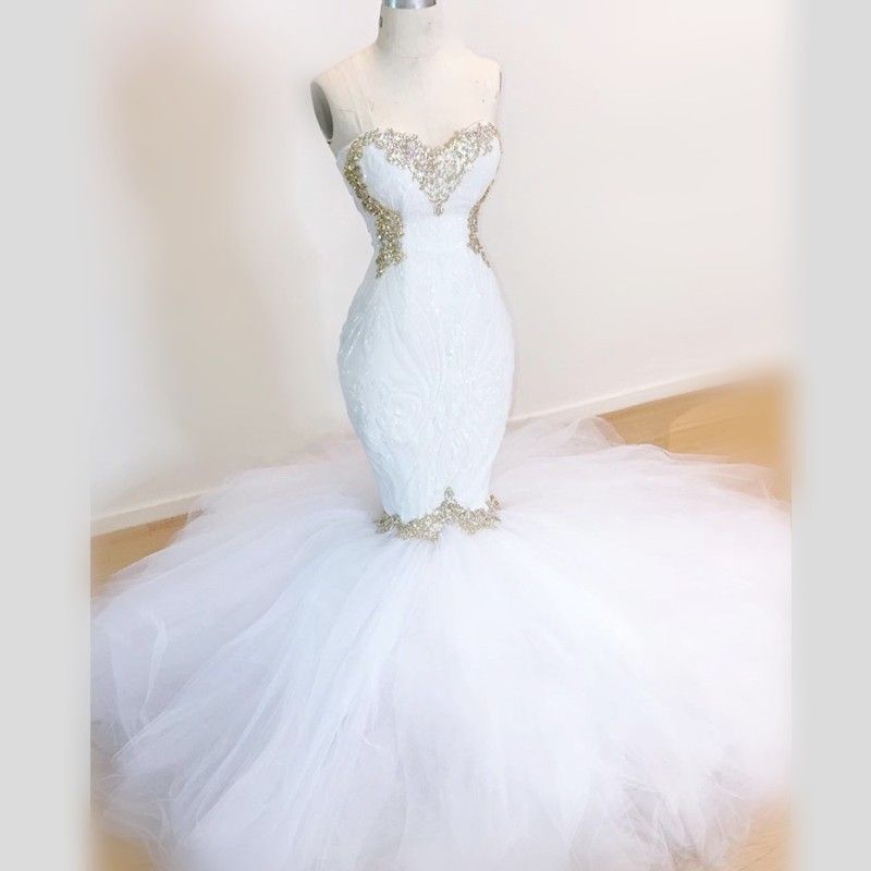 Discount White Mermaid Wedding Dresses Sweetheart Gold Appliques
