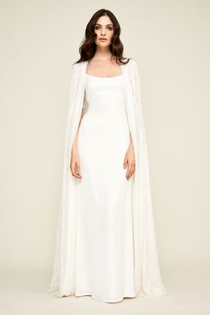Imported add a ladylike lace bridal cape to a lace or sleeveless wedding dress for a vintage inspired look with a touch of coverage. Renata long cape davids bridal the perfect accompaniment to a simple sheath dress this floor length lace cape is adorned in deco inspired embroidery. Available in ivory and white. By tadashi shoji polyester hook and eye closure dry clean imported the perfect accompaniment to a simple sheath dress this floor length lace cape is adorned in deco inspired embroidery.