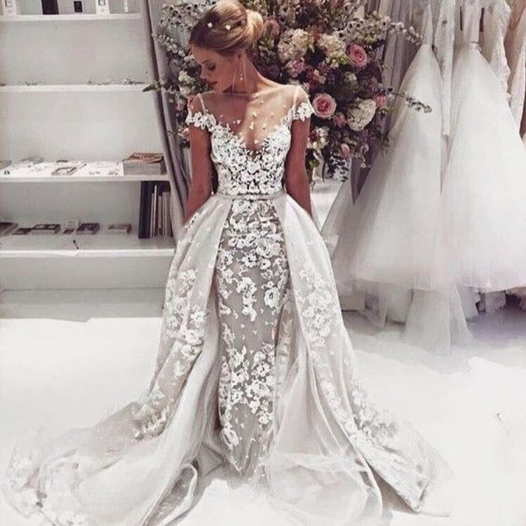 Unique Lace Appliques Mermaid Wedding Dresses With Detachable Skirt 2020 Jewel Neckline Cap Sleeves Buttons Back Bridal Gowns Aliexpress