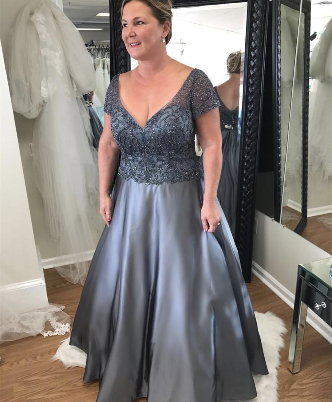 Long Gray Mother Of The Bride Dress Plus Size Short Sleeve V Neck