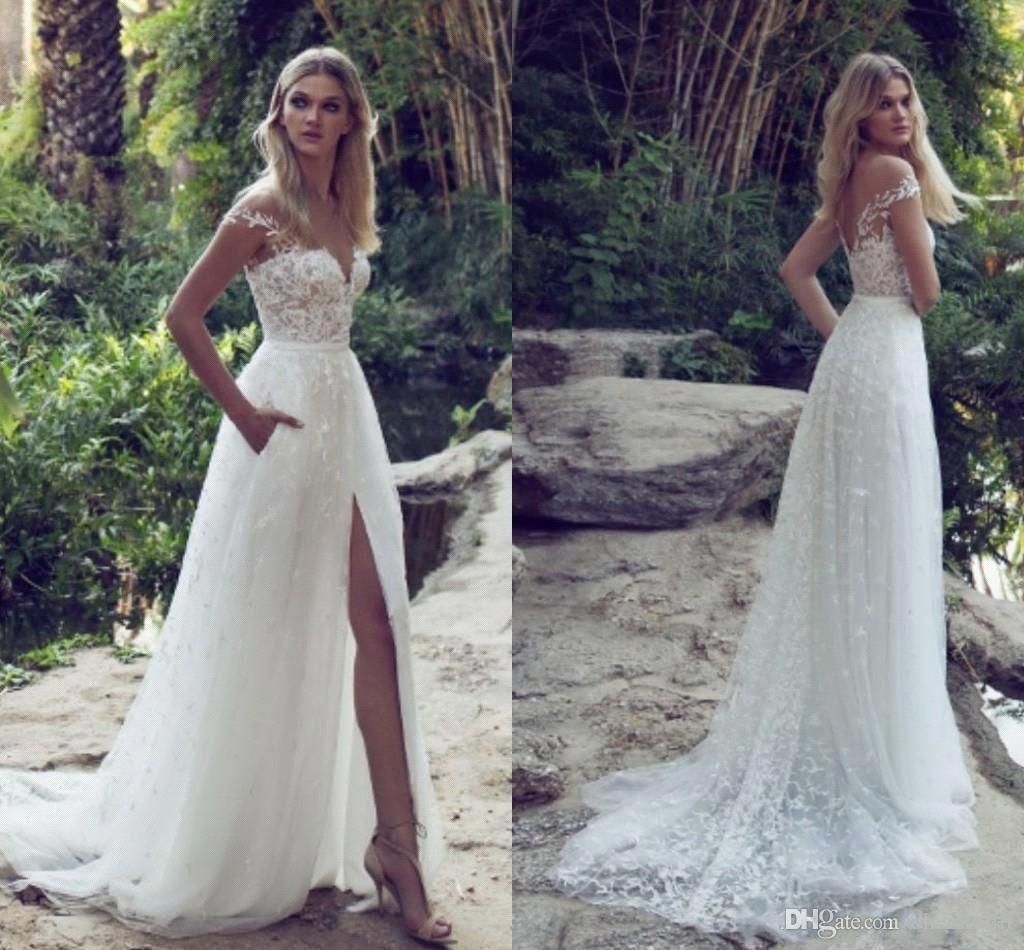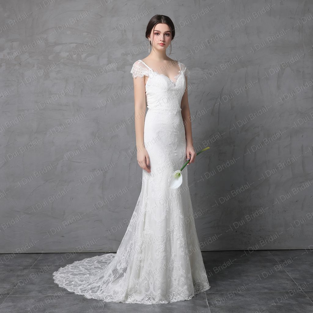 Ivory Cap Sleeve Sheath Lace Long Wedding Dress Open Back Cap