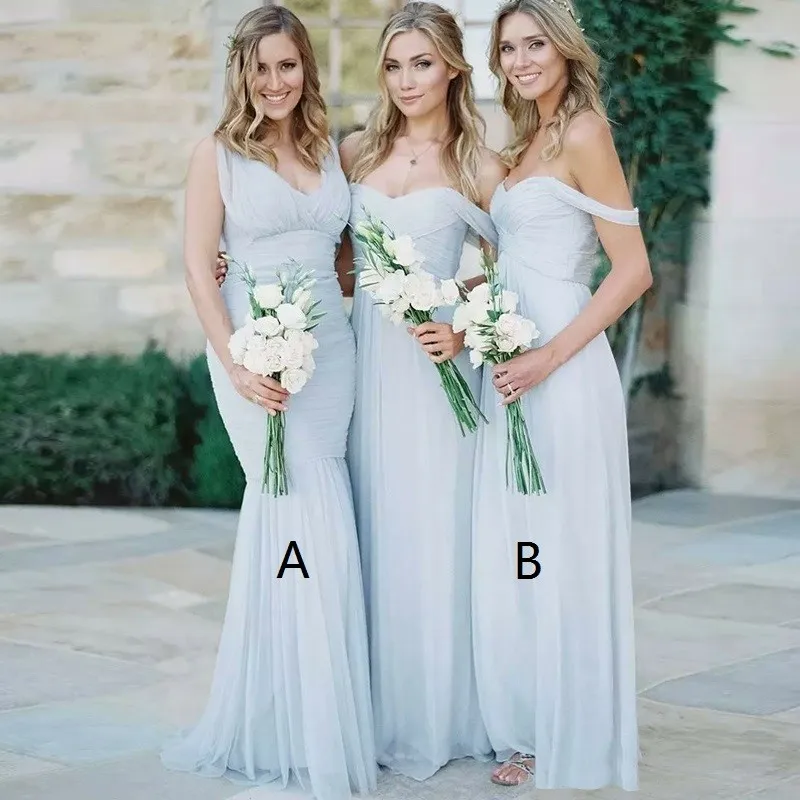 Simple Light Blue Square Neck Strap Tulle Bridesmaid Dresses Niceoo