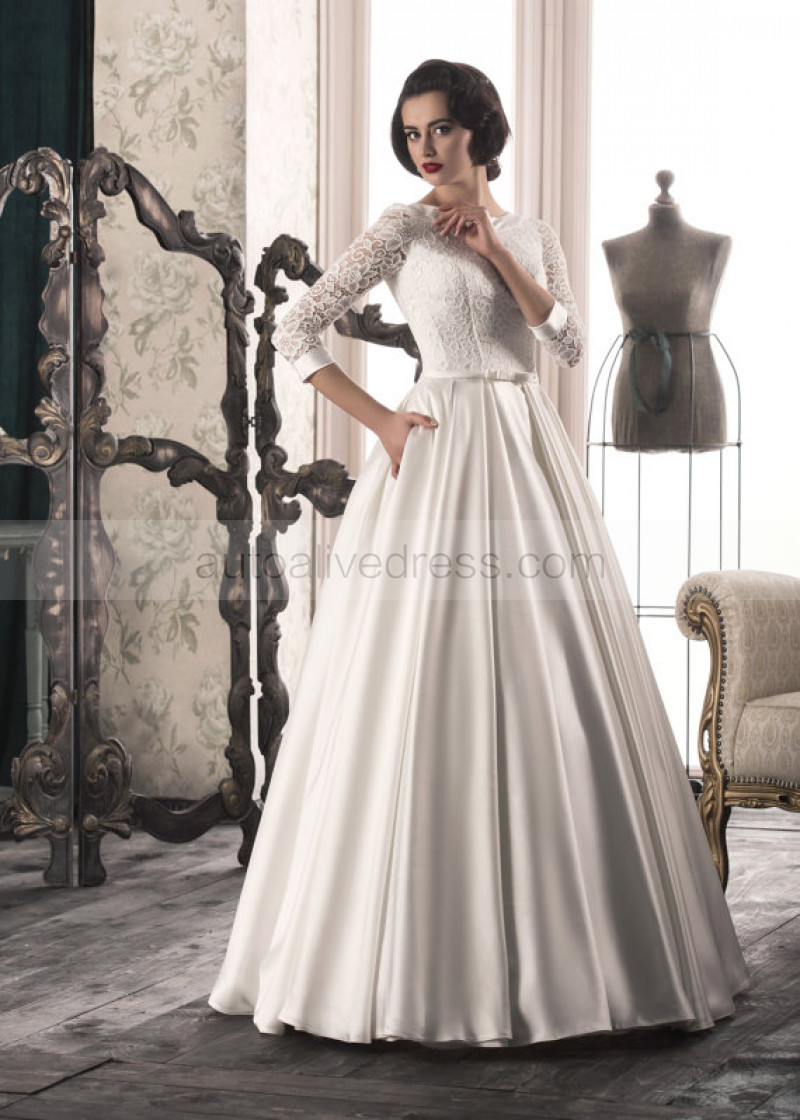 A Line Long Sleeves Corset Back Floor Length Ivory Lace Satin Wedding Dress