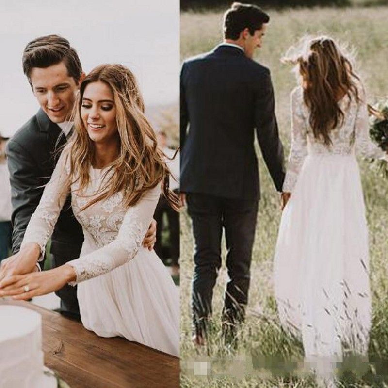 Vintage Lace Long Sleeves Boho Beach Wedding Dress 2020 Boat Neck