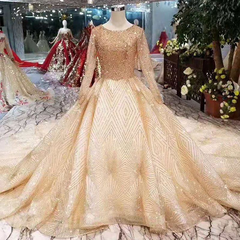 2019 Modest African Gold Lace Wedding Dress Beaded Ball Gown