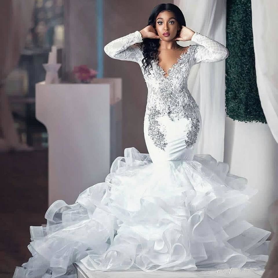 Luxury Arabic Mermaid Wedding Dresses V Neck Lace Beads Tiered Skirts Long Sleeve Wedding Dress Sweep Train Gorgeous Country Bridal Gowns Lace Mermaid Dress Mermaid Bridal Gowns From Sweety Wedding 203 8 Dhgate Com