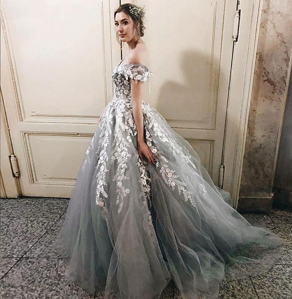 Discount Grey And White Lace Wedding Dress Ball Gown Off Shoulder