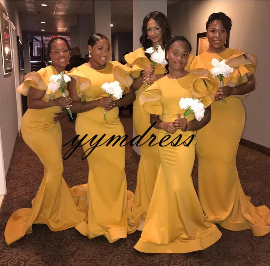 Yellow Bridesmaid Dresses 2019 Jewel Neck Sweeptrain Party Gowns