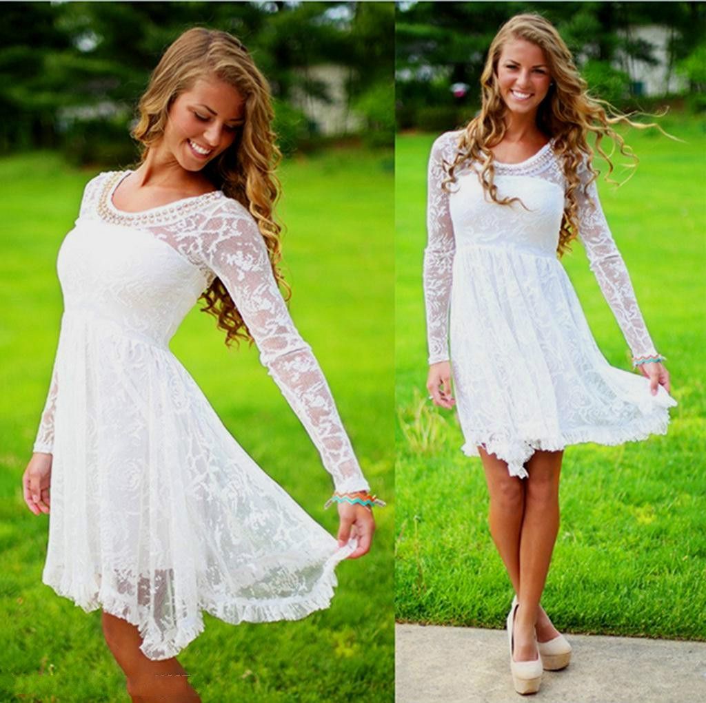 Discount 2019 Short White Wedding Dresses Long Sleeve Bateau