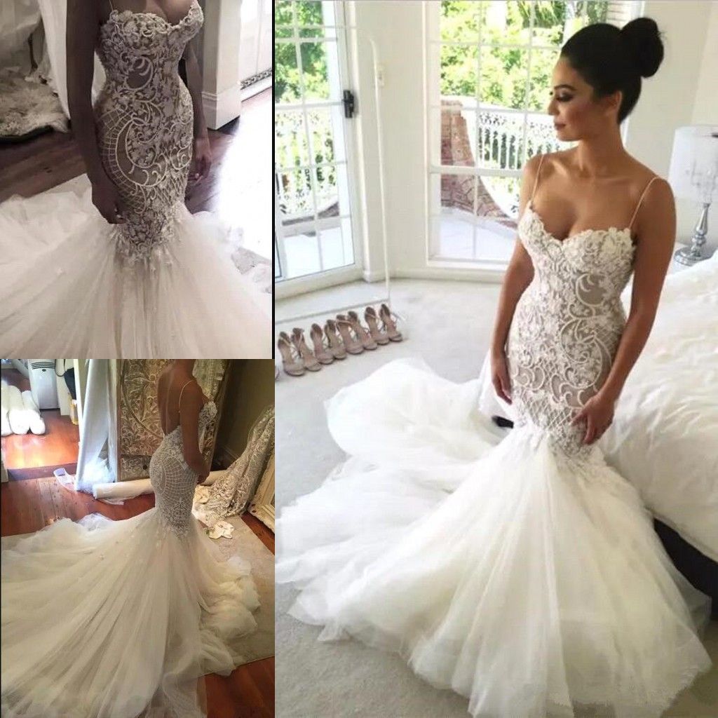 2017 Sexy Mermaid Wedding Dresses Spaghetti Straps Lace Sweetheart