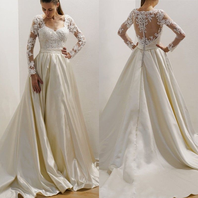 Discount Vintage A Line Long Sleeve Wedding Dress Covered Button