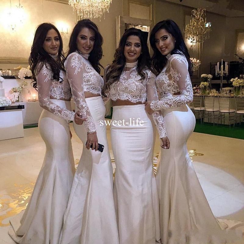 White Two Pieces Cheap 2020 Mermaid Bridesmaid Dresses Lace Top